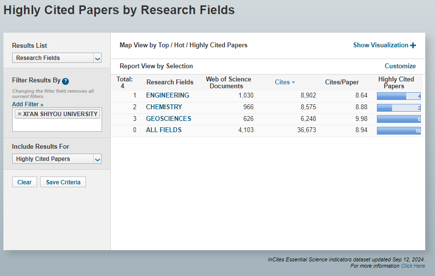 科睿唯安2024年9月公布的《基本科學(xué)指標(biāo)數(shù)據(jù)庫》(Essential Science Indicators,簡稱ESI)最新統(tǒng)計(jì)數(shù)據(jù)顯示,我校地球科學(xué)學(xué)科進(jìn)入ESI全球排名前1%,實(shí)現(xiàn)重要突破。至此,我校已有工程學(xué)、化學(xué)、地球科學(xué)3個(gè)學(xué)科進(jìn)入ESI全球排名前1%。