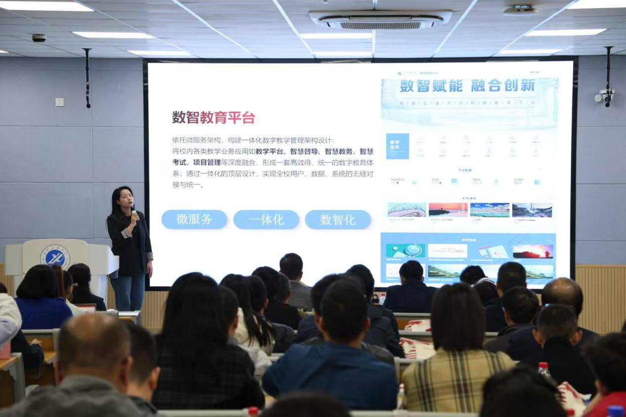 超星泛雅集團(tuán)高級(jí)講師作了題為《西安石油大學(xué)數(shù)智教育平臺(tái)的創(chuàng)新應(yīng)用與實(shí)踐》的培訓(xùn),通過(guò)介紹數(shù)智教育平臺(tái)整體情況、常態(tài)化混合式教學(xué)與應(yīng)用、智慧課程建設(shè)與成果培育三個(gè)方面,讓教師們了解了如何使用智慧平臺(tái)將傳統(tǒng)教學(xué)與現(xiàn)代信息技術(shù)相結(jié)合,打造高效、互動(dòng)的混合式教學(xué)模式,以及如何利用智能技術(shù)提升課堂質(zhì)量,實(shí)現(xiàn)教學(xué)的個(gè)性化和精準(zhǔn)化的方法。
