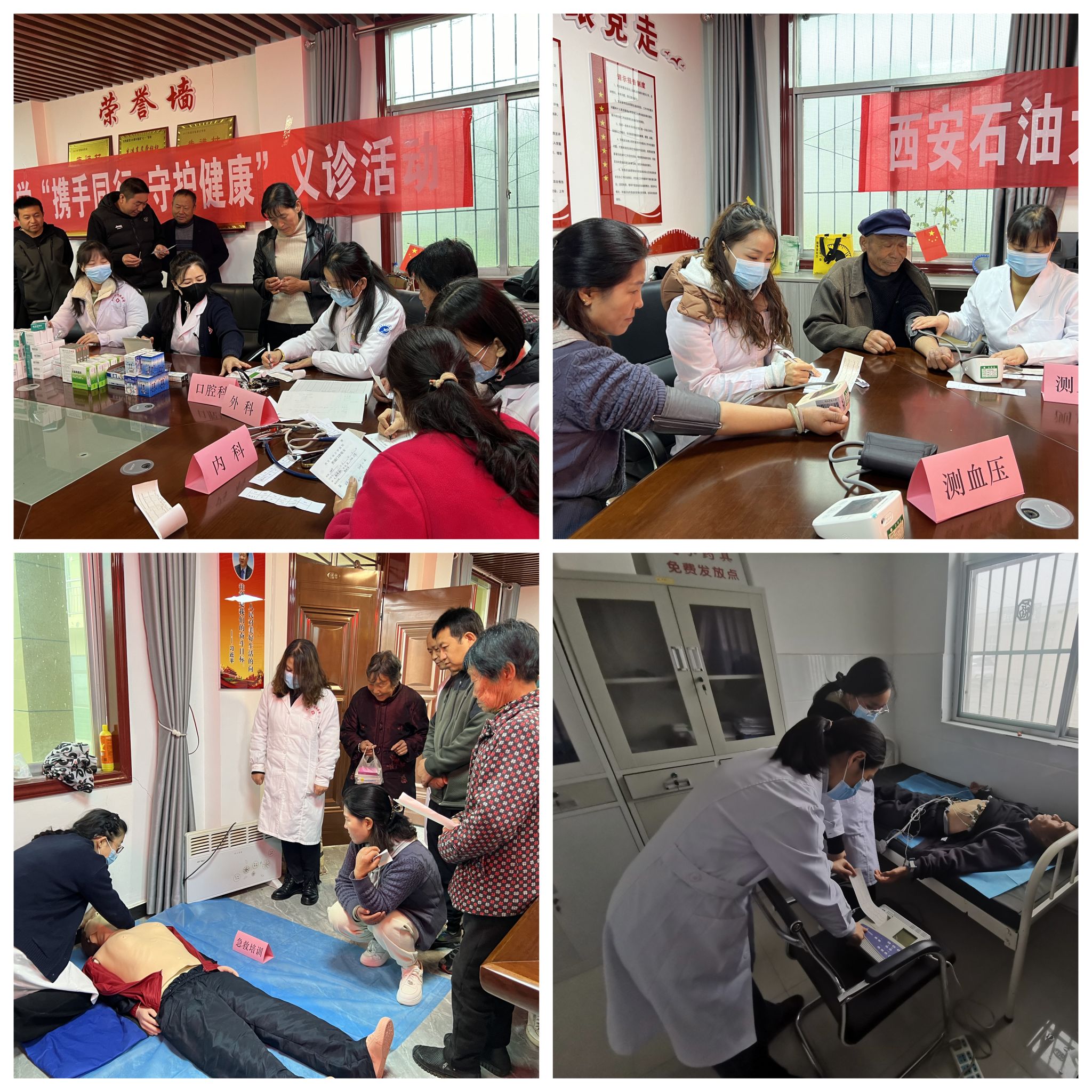 義診活動(dòng)現(xiàn)場,醫(yī)務(wù)人員熱情地接待前來看病或咨詢的村民,詳細(xì)詢問病史,耐心細(xì)致地進(jìn)行血壓、血糖、心電圖、內(nèi)科、外科、口腔科等各項(xiàng)檢查,根據(jù)檢查情況有針對性地對村民進(jìn)行常見病、慢性病的疾病知識科普,解疑答惑,叮囑飲食和用藥注意事項(xiàng)。義診現(xiàn)場還開展了急救知識技能培訓(xùn),醫(yī)護(hù)人員手把手教學(xué),向村民傳授心肺復(fù)蘇和海姆立克急救法的基本操作要領(lǐng)。為了助力鄉(xiāng)村振興建設(shè),校醫(yī)院積極辦實(shí)事,解民憂,已持續(xù)多年下鄉(xiāng)開展義診活動(dòng),不僅有利于增強(qiáng)村民健康保健意識,幫助其養(yǎng)成科學(xué)健康的生活方式,也進(jìn)一步提高了緊急情況下的自救互救能力。此次義診免費(fèi)發(fā)放藥品二十余種60余盒,發(fā)放宣傳資料100余份。