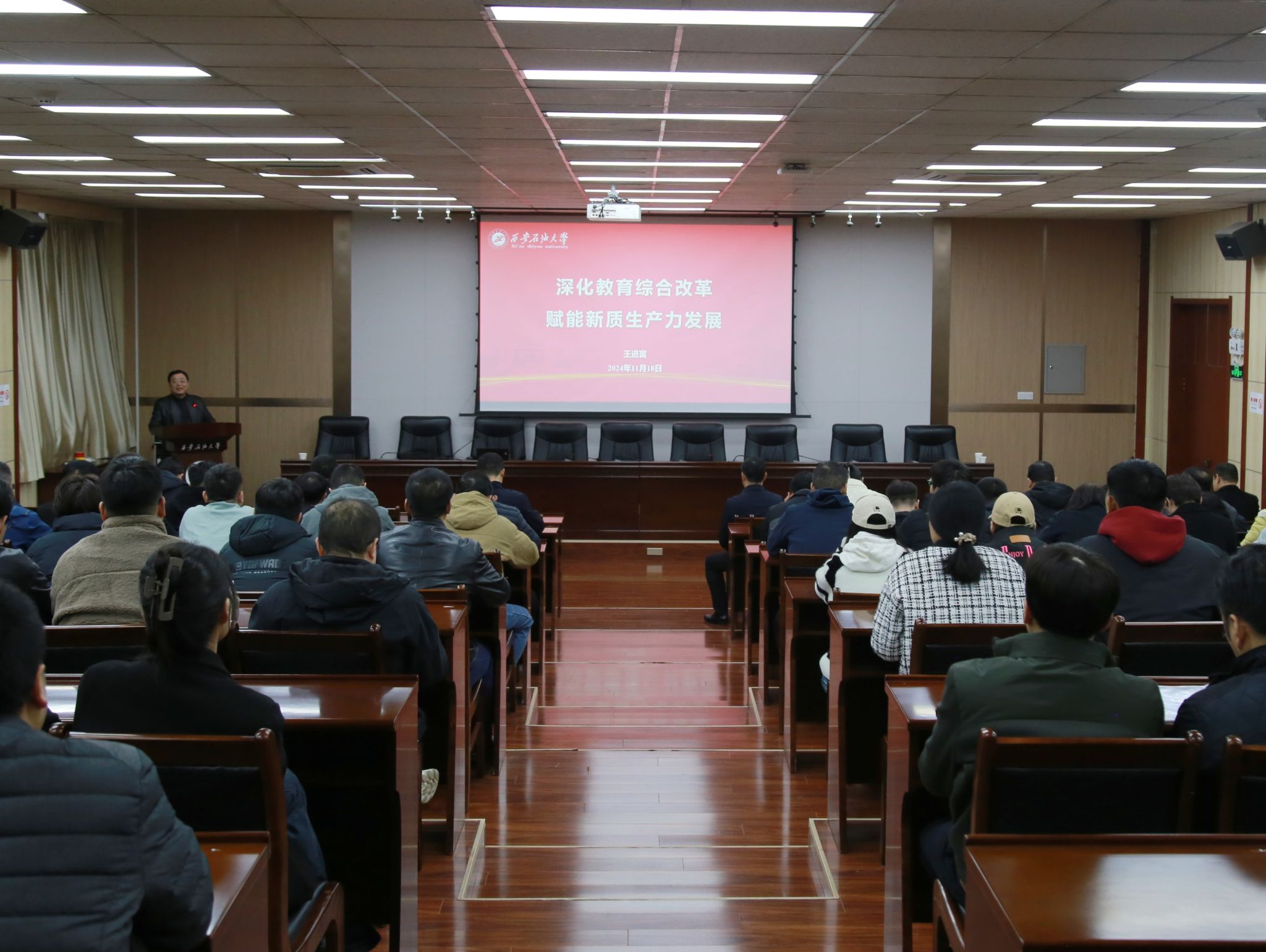 11月18日下午,校長王進(jìn)富在雁塔校區(qū)會議中心第五會議室為地球科學(xué)與工程學(xué)院領(lǐng)導(dǎo)班子、黨員和全體教職工以及雁塔校區(qū)研究生講授了題為“深化教育綜合改革賦能新質(zhì)生產(chǎn)力發(fā)展”的專題黨課和思政課。