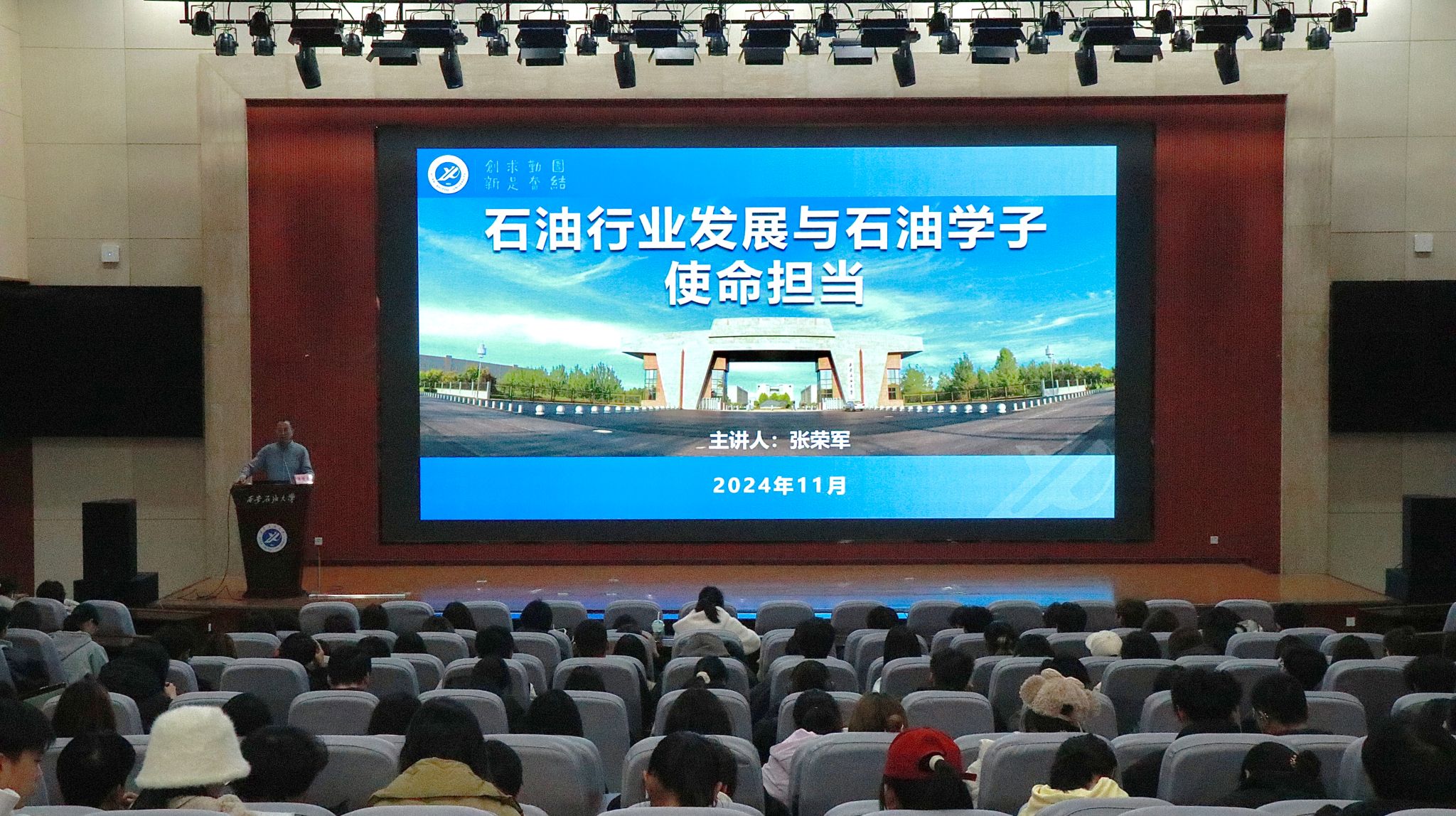 11月25日晚,副校長張榮軍在鄠邑校區(qū)弘石報告廳為人文學(xué)院學(xué)生講授題為“石油行業(yè)發(fā)展與石油學(xué)子使命擔(dān)當(dāng)”的專題思政課,人文學(xué)院學(xué)生工作干部、2024級全體本科生參加。