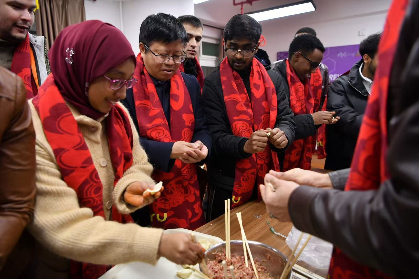 慰問期間,張驍勇與國際學(xué)生們一道實(shí)踐,親自示范包餃子的方法和蛇形剪紙技巧。大家圍坐在一起,歡聲笑語不斷,共同慶祝農(nóng)歷新年的到來。