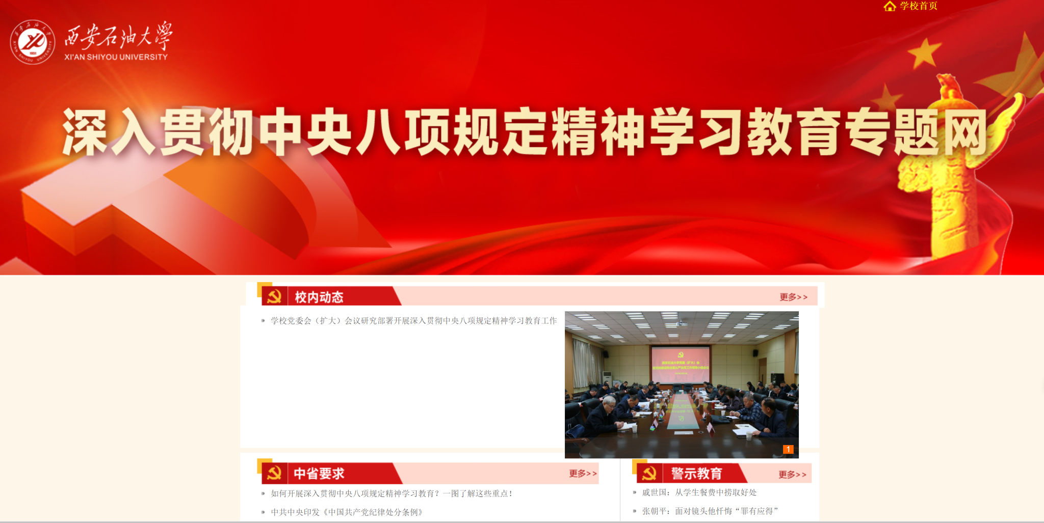 4月3日,“深入貫徹中央八項規(guī)定精神學習教育專題網站”開通上線。點擊學校主頁“深入貫徹中央八項規(guī)定精神學習教育”大圖,即可進入專題網站。