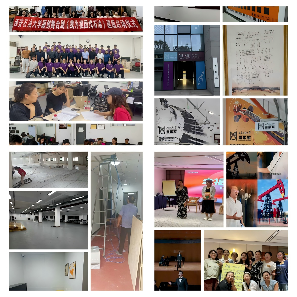 一是學(xué)科建設(shè)結(jié)碩果。原創(chuàng)音樂劇《我為祖國找石油——新中國第一支女子測量隊(duì)》獲批陜西省藝術(shù)創(chuàng)作重大資助項(xiàng)目,暑期團(tuán)隊(duì)封閉打磨劇目,確保高質(zhì)量完成首演。二是教學(xué)服務(wù)再升級。完成鄠邑校區(qū)琴房“一卡通”預(yù)約系統(tǒng)建設(shè)、琴房聲學(xué)構(gòu)建及舞蹈/瑜伽教室維修升級,持續(xù)提升教學(xué)服務(wù)水平。三是環(huán)境育人潤無聲。設(shè)計(jì)鄠邑校區(qū)辦公及公共空間文化宣傳展示,通過墻體和展板呈現(xiàn)發(fā)展歷程、辦學(xué)特色等,營造濃郁藝術(shù)氛圍,增強(qiáng)師生歸屬感。四是科研實(shí)踐交流齊推進(jìn)。積極推進(jìn)與陜西戲曲研究院深度合作;校合唱團(tuán)成功入選國家大劇院演出季,對接《云橫秦嶺》北京演出事宜;教師榮獲“云崗杯”國際民族器樂展演金獎(jiǎng);精心錄制的《石油人的歌》MV,以藝術(shù)之聲禮贊石油精神;10余人次參加研修班,提升教師隊(duì)伍素養(yǎng)。