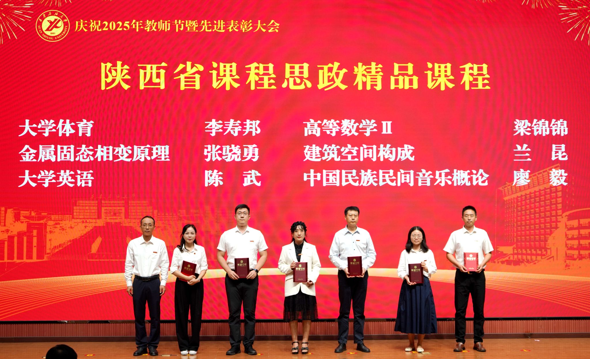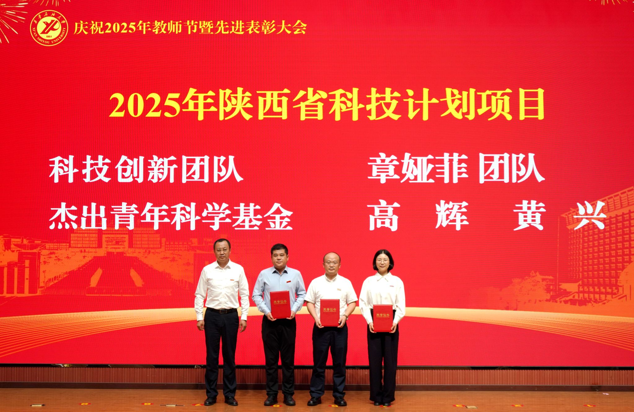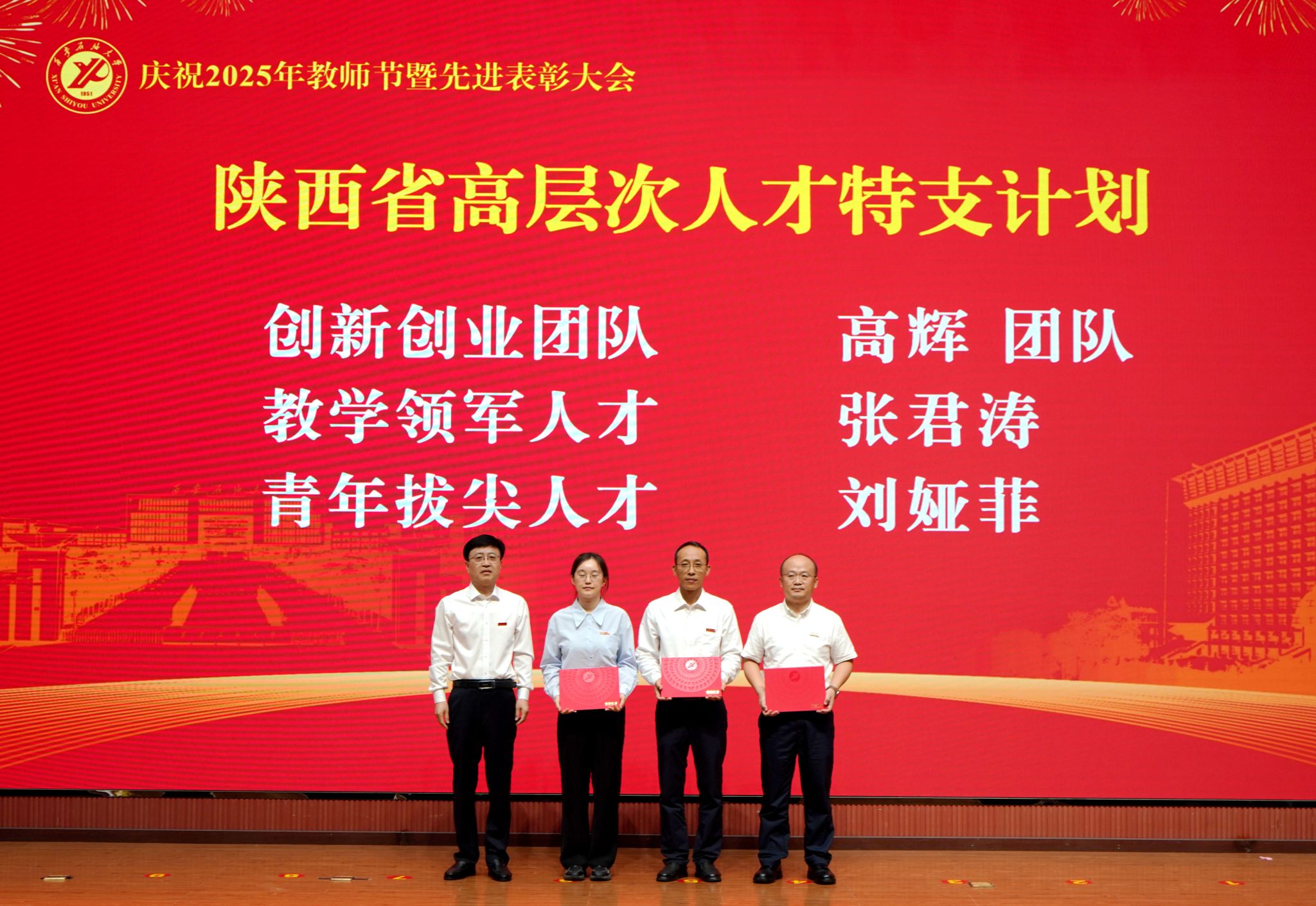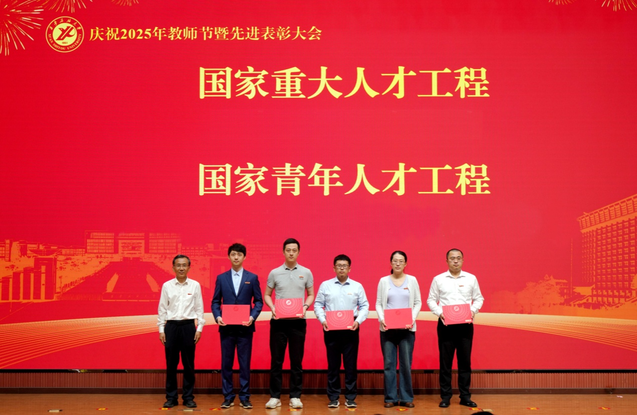表彰大會(huì)在國(guó)歌聲中開(kāi)始,校領(lǐng)導(dǎo)宣讀表彰決定,并為受表彰教師代表頒發(fā)證書(shū)和獎(jiǎng)?wù)?。校黨委副書(shū)記張木宣讀2024年度陜西省科學(xué)技術(shù)進(jìn)步獎(jiǎng)、國(guó)家重大人才工程和國(guó)家青年人才工程入選名單;校黨委副書(shū)記、紀(jì)委書(shū)記、監(jiān)察專員王輝強(qiáng)宣讀陜西省高層次人才特殊支持計(jì)劃等人選名單;副校長(zhǎng)蘇文甫宣讀陜西高校優(yōu)秀青年人才支持計(jì)劃、陜西省“三秦博創(chuàng)”人才支持項(xiàng)目、中國(guó)石油和化工自動(dòng)化行業(yè)科學(xué)技術(shù)獎(jiǎng)獲獎(jiǎng)名單;副校長(zhǎng)張榮軍宣讀2025年陜西省科技計(jì)劃項(xiàng)目(第三批、第四批)、陜西省2023年高等教育教學(xué)成果獎(jiǎng)和陜西省第十三屆基礎(chǔ)教育教學(xué)成果獎(jiǎng)獲獎(jiǎng)名單;副校長(zhǎng)張君濤宣讀陜西省課程思政精品課程,中國(guó)石油教育學(xué)會(huì)2024年石油高等教育教學(xué)成果獎(jiǎng)、首屆教師教學(xué)創(chuàng)新大賽、首屆課程思政教學(xué)大賽獲獎(jiǎng)名單;副校長(zhǎng)張驍勇宣讀《中共西安石油大學(xué)委員會(huì)關(guān)于表彰2025年師德先進(jìn)集體和先進(jìn)個(gè)人的決定》;副校長(zhǎng)趙健宣讀《西安石油大學(xué)關(guān)于表彰獎(jiǎng)勵(lì)“教書(shū)育人30年”教師的決定》《中共西安石油大學(xué)委員會(huì) 西安石油大學(xué)關(guān)于表彰2025年優(yōu)秀教師、先進(jìn)教育工作者的決定》;副校長(zhǎng)種宇宏宣讀第21屆陜西青年五四獎(jiǎng)?wù)潞偷诙萌珖?guó)大學(xué)生職業(yè)規(guī)劃大賽陜西省決賽獲獎(jiǎng)名單,全體與會(huì)校領(lǐng)導(dǎo)為受表彰教師代表頒發(fā)證書(shū)和獎(jiǎng)?wù)隆?/p>