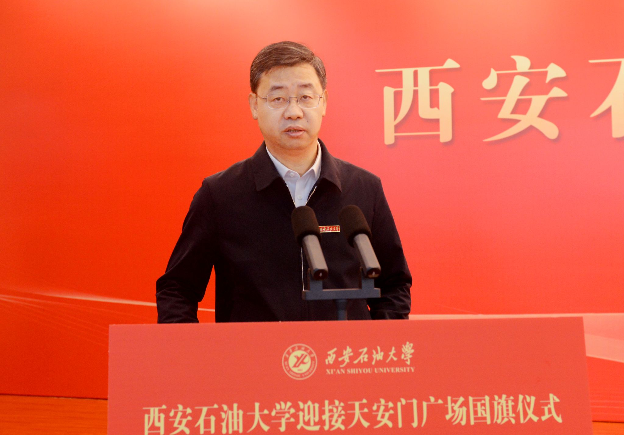 校長王進富發(fā)表致辭,他總結回顧了學校74年來與黨和國家同向同行、為祖國能源事業(yè)不懈奮斗的辦學歷程,強調(diào)學校始終“以‘石’為基、以‘油’鑄魂”, 在服務國家能源戰(zhàn)略中彰顯使命擔當,培養(yǎng)了一批又一批能源領域的棟梁之才。他向全體師生提出三點希望:一是希望全體師生高擎信仰之炬,把弘揚愛國主義精神作為永恒主題。要持續(xù)發(fā)揮好這面國旗的愛國主義教育功能,開展內(nèi)容豐富、形式多樣的愛國主義教育活動,營造愛黨愛國、愛校榮校的濃厚氛圍;二是希望全體師生堅定強國信念,把踐行奮斗實干擔當作為精神底色。要堅持石油精神辦學、鐵人精神育人、延安精神鑄魂,秉承“愛國奉獻、艱苦奮斗、科學求實、開拓進取”的辦學精神,全面落實立德樹人根本任務,不斷提升服務國家能源戰(zhàn)略與區(qū)域發(fā)展的能力,在教育強國建設中展現(xiàn)更大作為;三是希望全體師生挺膺擔當之志,把矢志能源報國使命作為畢生追求。廣大教師要弘揚教育家精神,以赤誠之心、奉獻之心、仁愛之心教書育人,做學生成長的引路人,廣大學子要秉承“好學力行、自強不息”的校訓,傳承鐵人精神,將使命扛在肩頭,為國家能源事業(yè)貢獻青春力量。