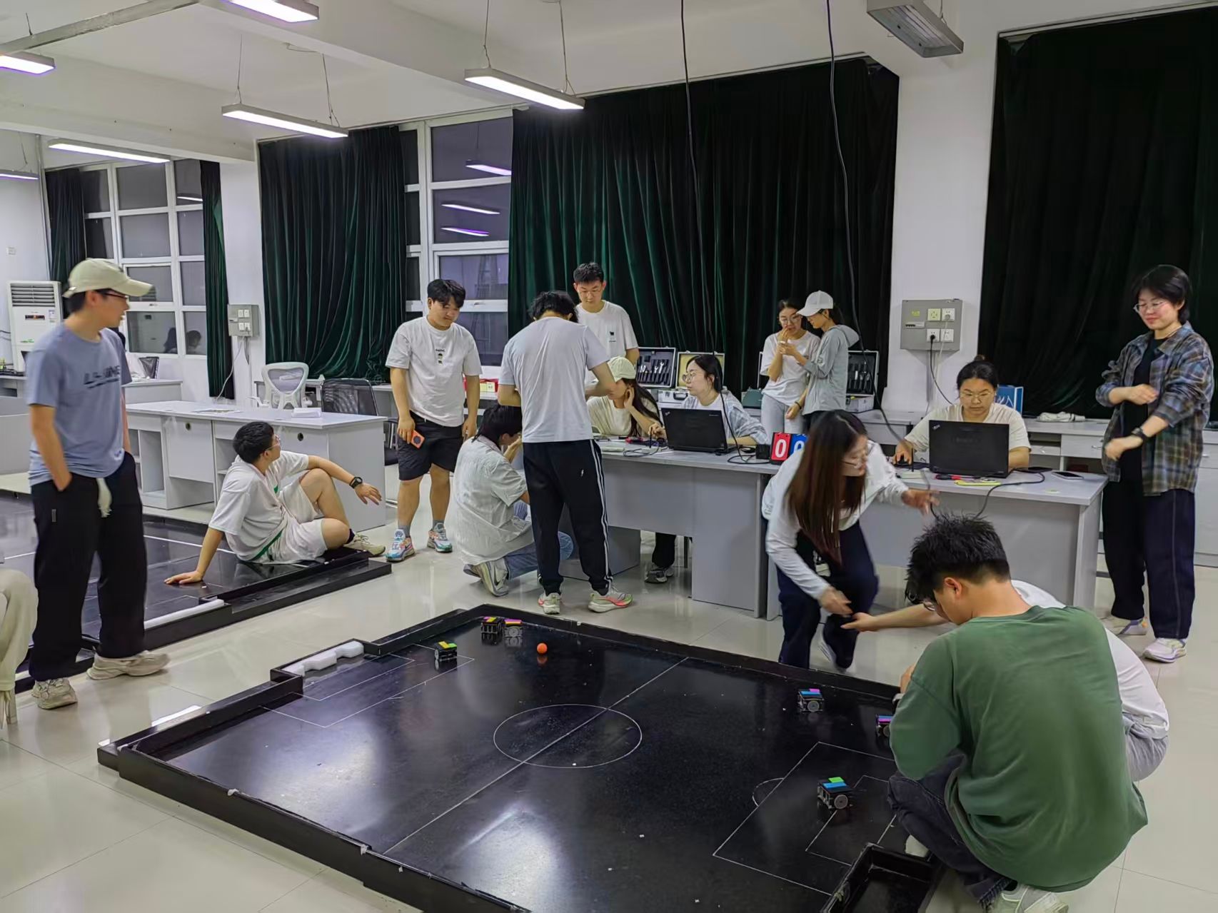 冠軍的獎杯,由機器人團隊師生無數(shù)個日夜的奮斗與汗水鑄就。為了備戰(zhàn)此次大賽,自今年年初便開始了校賽培訓、選拔和有計劃的集訓。FIRA小型組的機器人需要極高的敏捷性和復雜的多機協(xié)作算法,代碼組隊員們?yōu)榱艘粋€戰(zhàn)術動作,為了幾毫秒的速度提升,不斷進行算法優(yōu)化和調試。在高強度的比賽和訓練中,機器人面臨著持續(xù)的磨損與意外損傷,維護小組同學具備“外科醫(yī)生”般的精準與耐心,守護著機器人的“身體健康”,每日賽前進行全面的硬件檢測,賽后則立即進行保養(yǎng)檢修。從電機扭矩的細微校正、電池電量測定、小車胎皮檢測、傳感器靈敏度的反復標定,從線路連接的緊固到齒輪傳動的潤滑,確保了每一臺機器人都能以最佳狀態(tài)投入每一場比賽。正是有了平時的訓練有素,才有了賽場上的從容淡定。