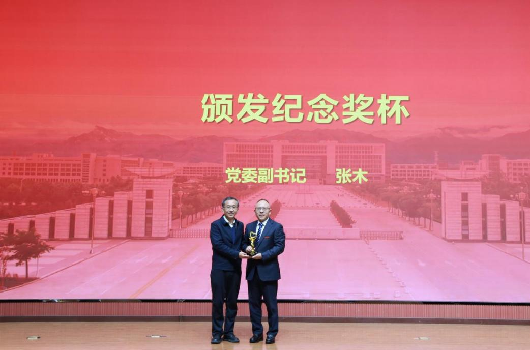 張木滿懷深情地宣讀《騰輝助學(xué)金廿周年慶典紀(jì)念冊(cè)》親筆序言,追憶1988年與何榮校友相識(shí)的點(diǎn)滴,激動(dòng)與感恩之情溢于言表,他深情地贊嘆何榮校友求學(xué)時(shí)的奮進(jìn)拼搏,與事業(yè)維艱之時(shí)仍堅(jiān)持回饋母校的赤子情懷。隨后,張木為何榮校友頒發(fā)“廿年初心?資助育人功勛獎(jiǎng)”紀(jì)念獎(jiǎng)杯,那沉甸甸的獎(jiǎng)杯滿載著全校師生對(duì)他二十年堅(jiān)守育人初心的崇高敬意,現(xiàn)場(chǎng)掌聲經(jīng)久不息。