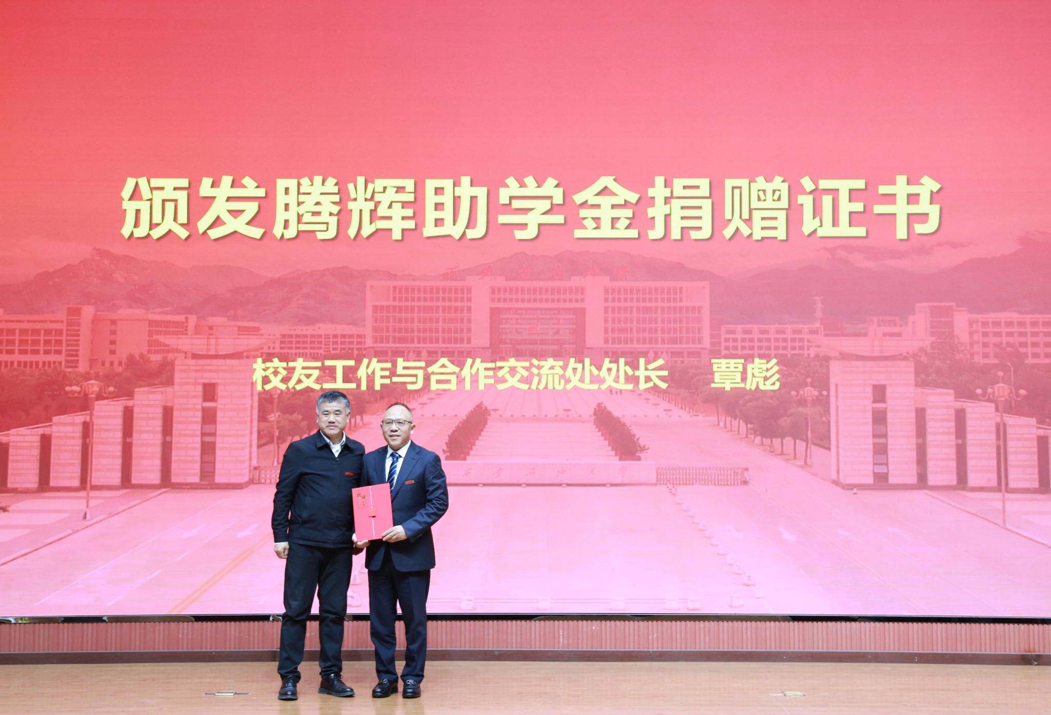 11月26日下午,騰輝助學(xué)金設(shè)立二十周年慶典暨2025年騰輝助學(xué)金發(fā)放儀式在鄠邑校區(qū)弘石學(xué)術(shù)報(bào)告廳舉行。校黨委副書記張木,騰輝助學(xué)金主要出資人、西安騰輝電氣有限公司總經(jīng)理、我校校友何榮,學(xué)生工作處、校友工作與合作交流處、團(tuán)委、機(jī)械工程學(xué)院負(fù)責(zé)人,西安騰輝電氣有限公司員工代表,往屆受助優(yōu)秀校友代表康琦、張凱鋒、寧世潔,2025年受助學(xué)生及各院系師生代表共400余人齊聚一堂,共憶育人初心,共話成長(zhǎng)擔(dān)當(dāng),慶典由副校長(zhǎng)種宇宏主持。