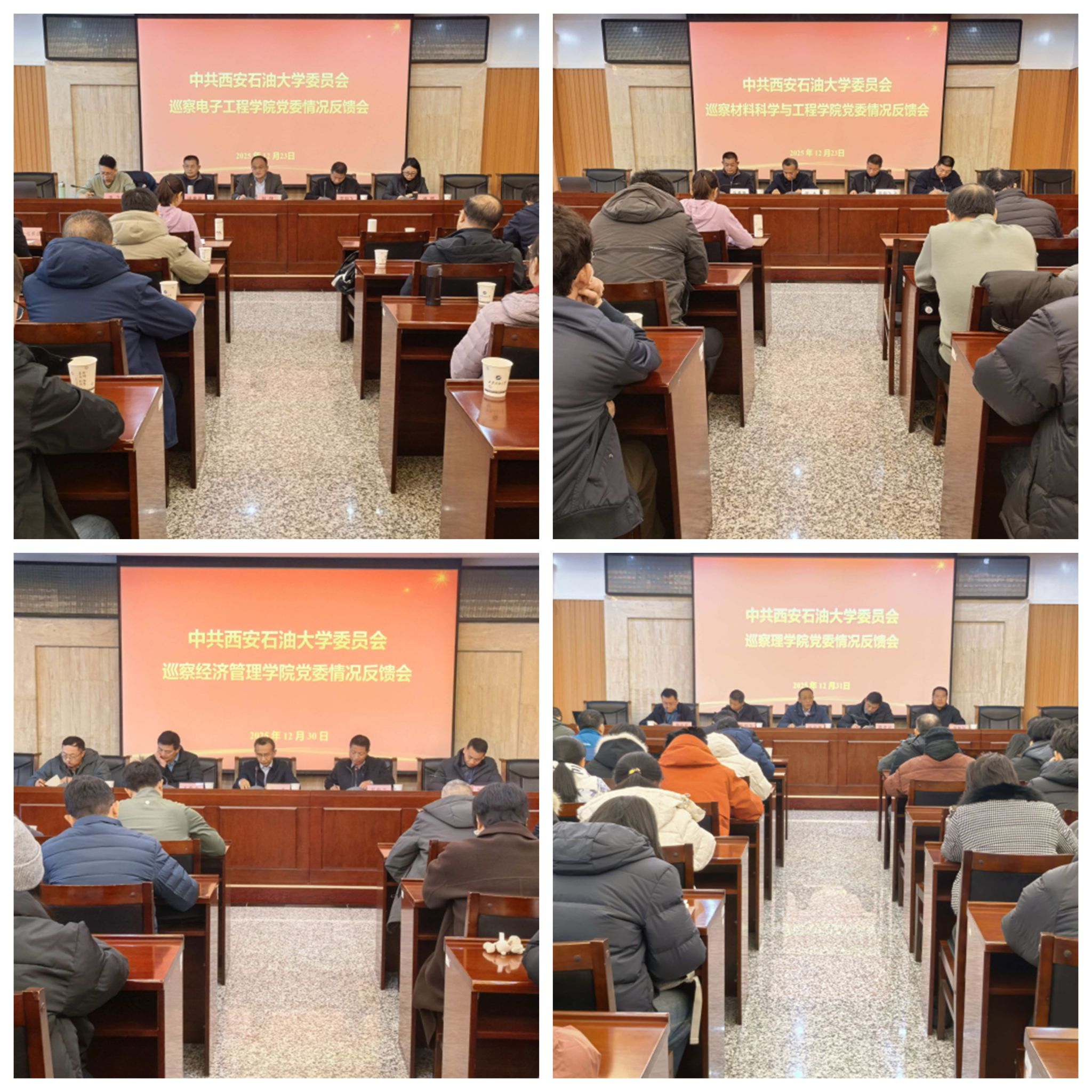反饋會上,黨委巡察工作辦公室主任茍毅飛宣讀了巡察反饋工作通知;第一巡察組組長龐秉謙、第二巡察組組長孟開元分別向電子工程學院黨委、材料科學與工程學院黨委和理學院黨委、經濟管理學院黨委反饋了巡察具體情況,并提出針對性意見建議;四個被巡察學院黨委書記作了整改表態(tài)發(fā)言。
