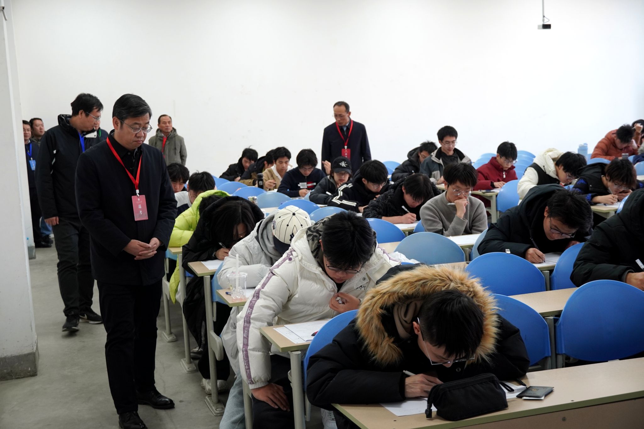 考試期間,校長王進(jìn)富,校黨委副書記張木、程永清,副校長張榮軍、張君濤等校領(lǐng)導(dǎo)率隊開展巡視工作。在黨委辦公室(校長辦公室)、組織部、宣傳部、學(xué)生工作部、教務(wù)處、科研處等部門負(fù)責(zé)人的陪同下,首先來到博覽樓可視化中心,通過實時視頻監(jiān)控系統(tǒng)察看了各考場的整體情況,隨后深入教學(xué)樓多個考場進(jìn)行現(xiàn)場巡查。巡視過程中,校領(lǐng)導(dǎo)仔細(xì)詢問了考場布置、監(jiān)考安排、考試秩序以及學(xué)生的應(yīng)考狀態(tài),對考試組織工作的嚴(yán)謹(jǐn)性、考場紀(jì)律的良好表現(xiàn)以及全體考務(wù)人員的辛勤付出給予充分肯定。