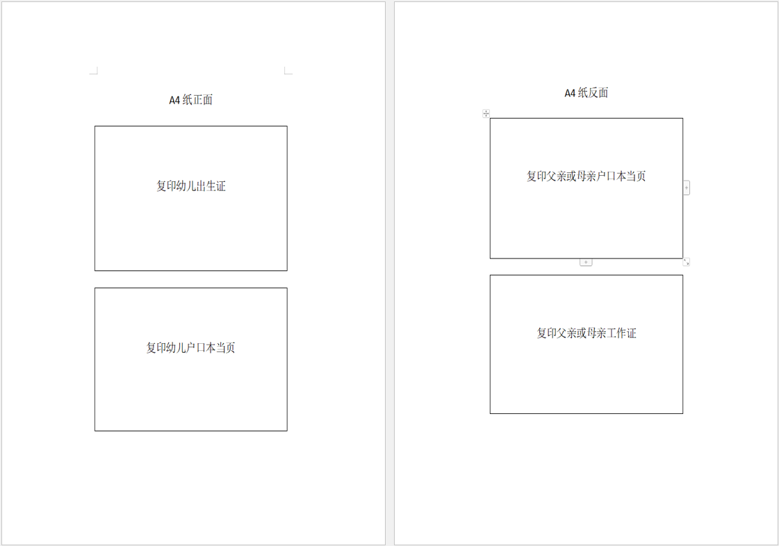 辦理入園手續(xù)時,家長需攜幼兒出生證明原件及復(fù)印件、幼兒戶口本當(dāng)頁復(fù)印件、父親或母親戶口本當(dāng)頁復(fù)印件、父親或母親本人工作證復(fù)印件(以上資料請?zhí)崆笆褂肁4紙依次進(jìn)行雙面復(fù)印,復(fù)印模板附后)。