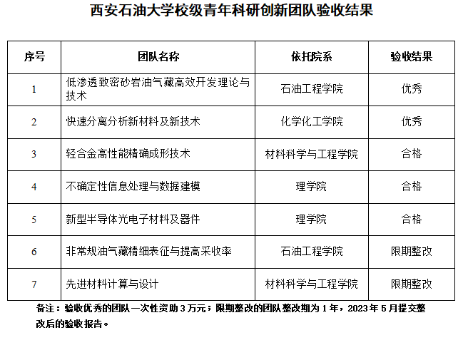 根據(jù)《西安石油大學(xué)科研創(chuàng)新團(tuán)隊(duì)建設(shè)與管理辦法》與《西安石油大學(xué)青年科研創(chuàng)新團(tuán)隊(duì)建設(shè)與管理辦法》(西石大科〔2021〕23號(hào))文件精神及學(xué)校關(guān)于團(tuán)隊(duì)考核的通知要求,經(jīng)團(tuán)隊(duì)自評(píng)申報(bào)、院系審核、科技處審查、學(xué)校組織專家評(píng)審等環(huán)節(jié),現(xiàn)將各類團(tuán)隊(duì)期滿驗(yàn)收和中期檢查結(jié)果公示如下。