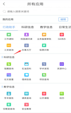 已安裝“i西石大” APP的師生,登錄成功后,通過點擊“首頁”->“全部應(yīng)用”->“行政助手”中的“辦事大廳”進入網(wǎng)上服務(wù)大廳,選擇相關(guān)業(yè)務(wù)進行辦理。