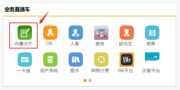 (2) 學(xué)校首頁下方快速通道的“服務(wù)門戶”登錄后,選擇服務(wù)門戶“首頁”->“業(yè)務(wù)直通車”中的“辦事大廳”進入網(wǎng)上服務(wù)大廳;
