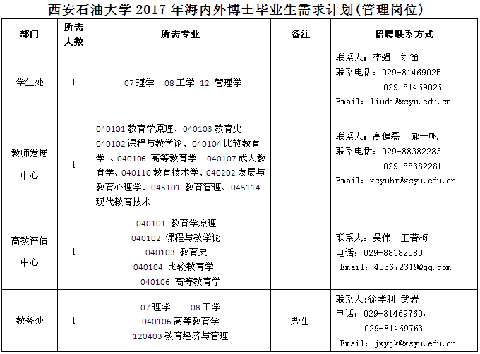 西安石油大學2017年海內(nèi)外博士畢業(yè)生需求計劃(管理崗位)