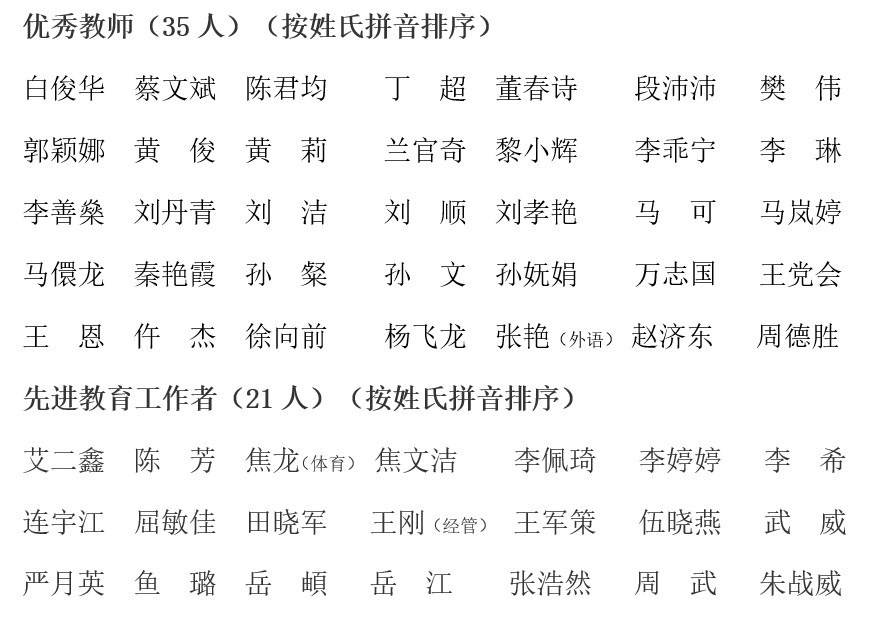 根據(jù)《西安石油大學(xué)優(yōu)秀教師 先進教育工作者評選表彰辦法》(西石大黨[2021]47號)和《關(guān)于2024年度優(yōu)秀教師、先進教育工作者推薦評選的通知》,經(jīng)學(xué)校優(yōu)秀教師、先進教育工作者評選表彰工作領(lǐng)導(dǎo)小組評選,現(xiàn)將2024年優(yōu)秀教師、先進教育工作者公示如下: