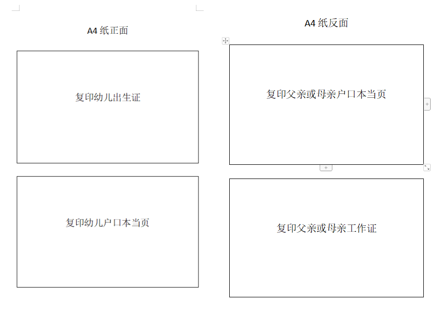 辦理入園手續(xù)時家長需攜幼兒出生證明原件及復(fù)印件、幼兒戶口本當(dāng)頁復(fù)印件、父親或母親戶口本當(dāng)頁復(fù)印件、父親或母親本人工作證復(fù)印件(以上資料請?zhí)崆笆褂肁4紙依次進行雙面復(fù)印,復(fù)印模板附后)?,F(xiàn)場查看工作證原件,請攜帶。
