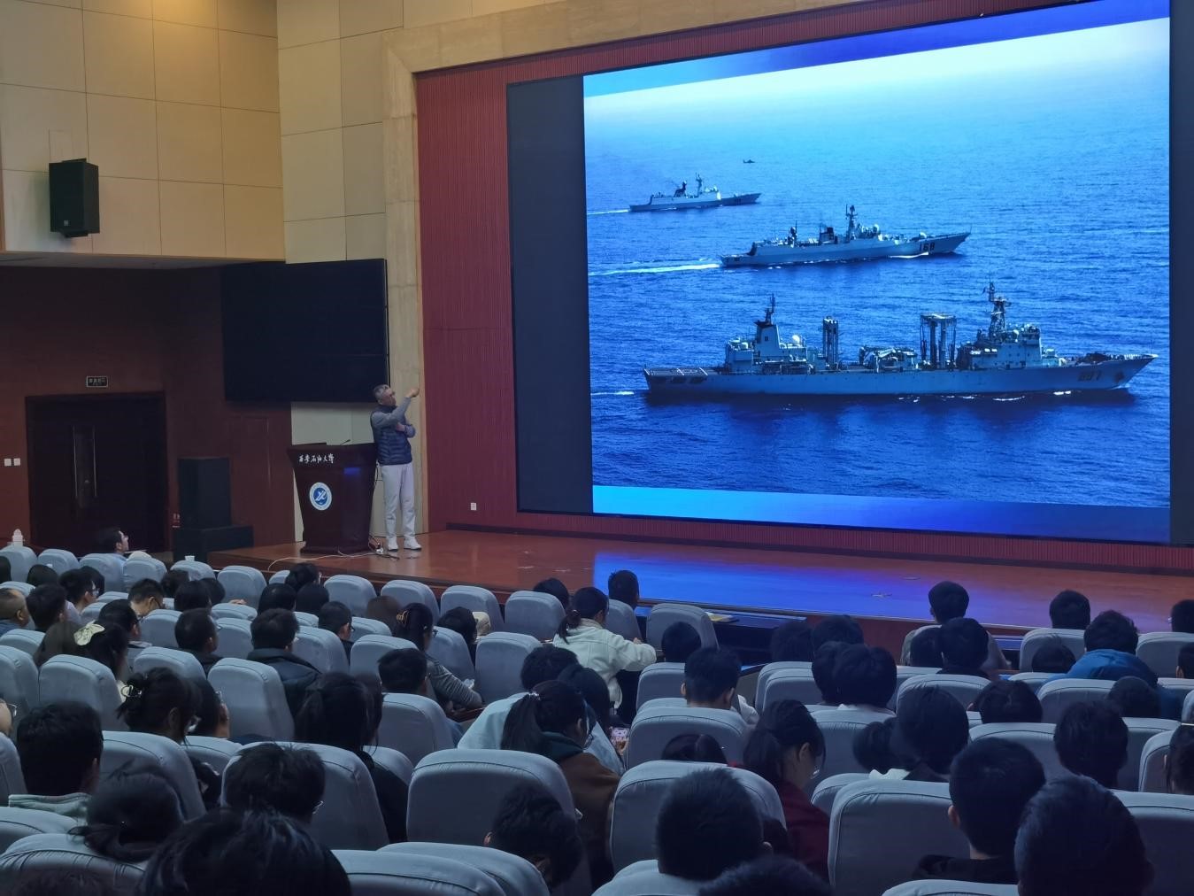 為深入學習貫徹習近平新時代中國特色社會主義思想,切實開展大學生“學強軍思想、鑄忠誠之魂”主題教育,幫助師生了解中國海軍走向“深藍”背后的故事,11月20日下午,我校學生工作部特邀請原中國海軍南海艦隊政治部副主任、第五批亞丁灣護航編隊政委、海軍少將陳儼在我校鄠邑校區(qū)弘石報告廳為全體師生作“從淺藍走向深藍——亞丁灣護航與海洋強國”主題報告。本次報告會由學生工作部部長王亮主持,全體學工干部與學生代表400余人聆聽了報告。
