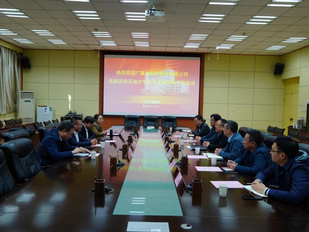 陳濤書記代表土木工程學(xué)院對雷鵬副總裁一行來訪表示熱烈歡迎,并邀請雙方共同觀看西安石油大學(xué)宣傳片。李俊亭副院長介紹了學(xué)?;厩闆r,并就土木工程學(xué)院學(xué)科專業(yè)設(shè)置、師資隊(duì)伍、人才培養(yǎng)特色、未來發(fā)展方向等方面進(jìn)行了介紹。他表示,學(xué)院工程管理專業(yè)自創(chuàng)辦之初就與廣聯(lián)達(dá)公司開展了相關(guān)業(yè)務(wù)合作,雙方聯(lián)系緊密,廣聯(lián)達(dá)近年來深耕數(shù)字建筑、智能建造的發(fā)展定位為雙方提供了更廣闊的合作空間,希望以本次交流為契機(jī)進(jìn)一步創(chuàng)新合作機(jī)制,在雙方產(chǎn)教融合業(yè)務(wù)中充分發(fā)揮雙方自身優(yōu)勢,在專業(yè)建設(shè)、本科生就業(yè)實(shí)習(xí)基地建設(shè)、校企聯(lián)合參與學(xué)科競賽、研究生聯(lián)合培養(yǎng)基地建設(shè)、實(shí)驗(yàn)室共建等方面深化合作,實(shí)現(xiàn)互利共贏。