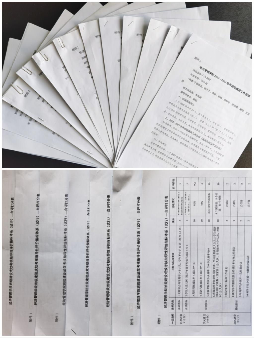近日,經(jīng)濟管理學(xué)院2022—2023學(xué)年班級建設(shè)考核工作順利完成,學(xué)院組織專人對大二至大四各班級進行考核,考核堅持以總結(jié)得失為主導(dǎo)、以量化考核為關(guān)鍵、以建設(shè)成效為重點,主要考察五個方面:一是思想武裝,包括主題班會的召開、學(xué)生入黨比例;二是學(xué)風(fēng)建設(shè),包括大學(xué)英語四、六級通過率、班級考試課程不及格率、學(xué)科競賽獲獎(立項)數(shù);三是班風(fēng)建設(shè),包括年度目標和工作計劃及總結(jié)、班委會會議、團建活動、違紀處分等;四是綜合發(fā)展,包括班級成員參加非專業(yè)類競賽獲獎、宿舍衛(wèi)生優(yōu)良率、社會實踐和公益活動參與度等;五是工作創(chuàng)新,包括創(chuàng)新、特色的班級建設(shè)模式、載體、活動等。