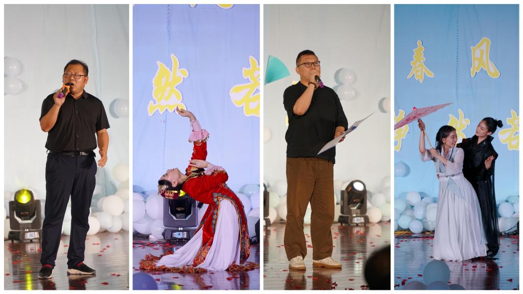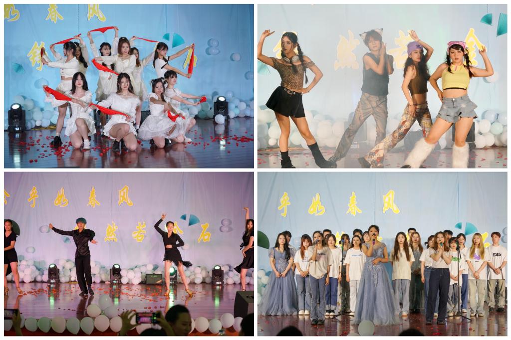 晚會在傳統(tǒng)服飾T臺秀中拉開序幕,模特們緩步徐行,雅而內(nèi)斂,文而柔韌。一步一動,動搖清風,收放間盡顯文人風骨,人文學子們用這種獨特的方式展示自己對傳統(tǒng)文化的認知和熱愛;方松林副院長和新聞系鄧笑然老師的詩文配樂朗誦《詩意中國》,激昂高亢與輕柔婉約并存,描繪著一幅國泰民安的景象;學生表演歌曲《千里之外》、《天若有情》、《不染》、《Love story》、《藍蓮花》,他們是舞臺的中心,用優(yōu)美的歌聲讓臺下的觀眾感受到了青春的律動,展示了活力十足的青年模樣;新聞系李臻老師與學生knock樂隊共同演繹《你不要擔心》、《推開世界的門》,歌聲化作翅膀、唱響希望,期待我們奔赴下一場詩與遠方;舞蹈《玫瑰人生》、《恰?!?、《晨曦中的玫瑰》、《Queencard》、《緣起》,在律動節(jié)奏中、在舞臺燈光下,整齊劃一的舞姿,恰到好處的卡點,一上場便引來陣陣驚呼,尖叫聲和掌聲不絕于耳,青春洋溢、激情四射,她們用舞姿展現(xiàn)自己的青春風采;中文系薛永剛老師的一首朗誦《再別康橋》,在輕悠的配樂中,用飽滿的感情將聽眾帶進詩中,在詩里感受徐志摩的眷戀之情,體會纏綿惜別的心情;方松林副院長帶來的《同一首歌》、《再見》,優(yōu)美的旋律、仿佛隨著歌聲飄蕩進了我們的心靈深處,引起了觀眾們的共情,全場進行合唱;最后,學院學生會的學生干部將一首小合唱《記念》,送給即將告別的學長學姐們:雖然即將遠航,我們依然不說再見,我們期待更好的明天。