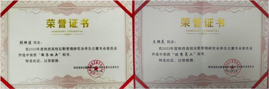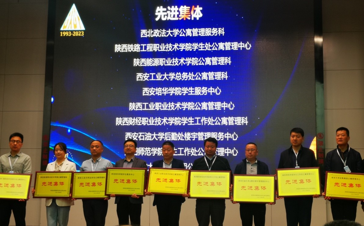 5月26日,由陜西高校后勤管理研究會(huì)主辦的“2023年陜西高校學(xué)生公寓專業(yè)委員會(huì)年會(huì)暨學(xué)生公寓專業(yè)委員會(huì)成立三十周年慶典”上,我校后勤處樓宇管理服務(wù)中心榮獲“陜西高校學(xué)生公寓先進(jìn)集體”榮譽(yù)稱號(hào),樓宇管理服務(wù)中心張麗潔、王朝美同志分別榮獲陜西高校學(xué)生公寓服務(wù)標(biāo)兵和優(yōu)秀員工榮譽(yù)稱號(hào)。同時(shí),由樓宇管理服務(wù)中心撰寫的“不忘初心擔(dān)使命,立足本職護(hù)校園”在公寓專業(yè)委員會(huì)三十周年主題征文活動(dòng)中獲得特等獎(jiǎng)。