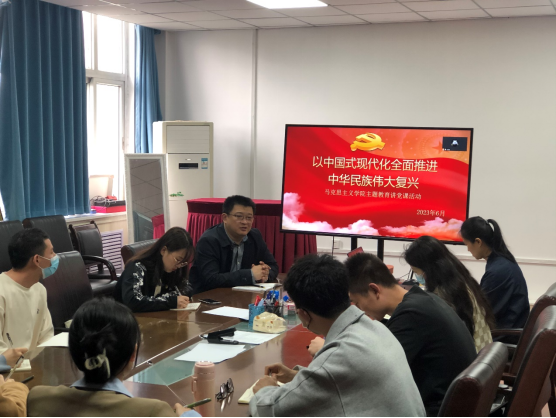 為深入學(xué)習(xí)貫徹習(xí)近平新時代中國特色社會主義思想,深刻學(xué)習(xí)領(lǐng)會黨的二十大精神,用黨的創(chuàng)新理論統(tǒng)一思想、凝聚共識、提振精神、激發(fā)干勁,激勵廣大青年時刻以歷史主動精神涵養(yǎng)建設(shè)中國式現(xiàn)代化的責(zé)任擔(dān)當(dāng),進一步推進主題教育走深走實,6月5日上午,馬克思主義學(xué)院院長張海濤教授在雁塔校區(qū)華油能源樓818會議室為研究生第一黨支部全體黨員講授了題為《以中國式現(xiàn)代化全面推進中華民族偉大復(fù)興》的專題黨課,黨課由輔導(dǎo)員童玲主持。