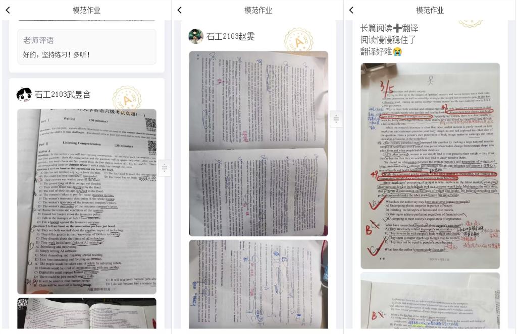 學(xué)院開展以“宿舍—班級(jí)—學(xué)院”三級(jí)聯(lián)動(dòng)的英語四級(jí)幫扶計(jì)劃。宿舍以“一帶一”“一帶多”帶動(dòng)英語學(xué)習(xí),營造濃厚的英語學(xué)習(xí)氛圍。班級(jí)以建群打卡背單詞、英語四級(jí)朋輩課堂等督促學(xué)生努力學(xué)習(xí)英語,為英語較差的同學(xué)鞏固英語基礎(chǔ),為英語較好的同學(xué)保持英語水平。學(xué)院定時(shí)開展英語四級(jí)講座、英語四級(jí)模擬考,為學(xué)生傳授英語四級(jí)通過技巧,并讓學(xué)生在考試中、在實(shí)際應(yīng)用中逐漸進(jìn)步。