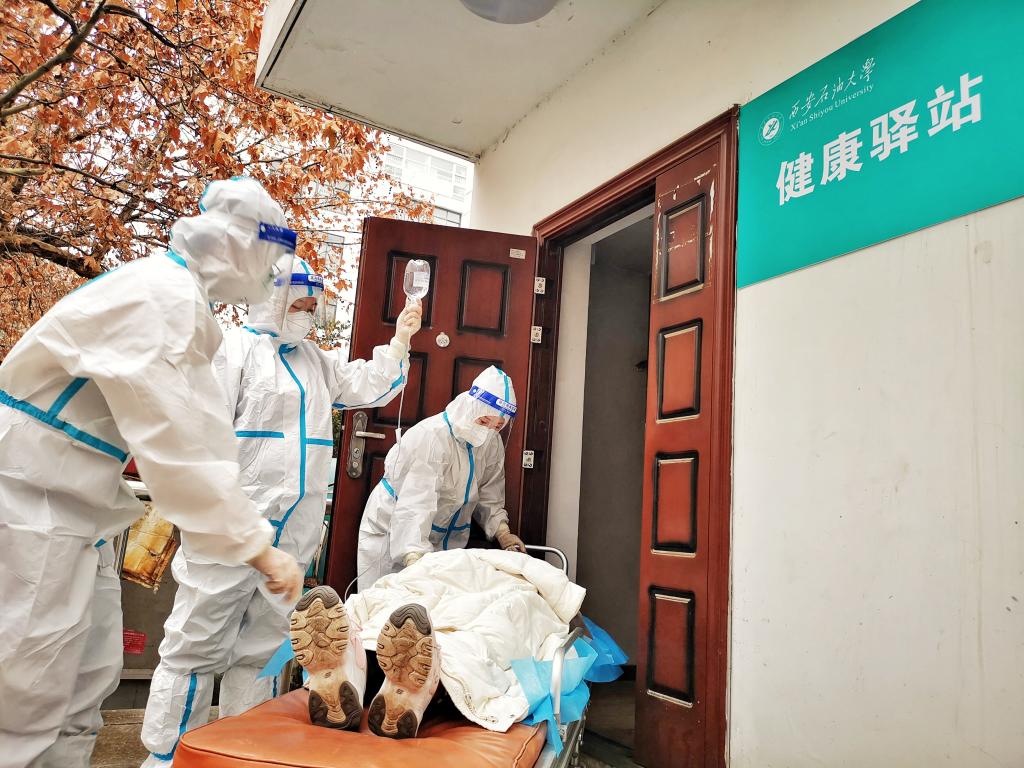 本次活動以健康驛站的一名新冠病毒肺炎患者突發(fā)身體嚴重不適的情況為演練場景。驛站工作人員接到求救信息后立即報告驛站工作專班負責人,救治小組攜帶制氧機、血氧儀和AED等設(shè)備迅速到達現(xiàn)場,通過對患者體溫、血壓、脈搏、血氧飽和度等檢查快速判斷患者的生命體征,在撥打120救助后,立即開展心肺復(fù)蘇、電除顫、給氧、施針搶救等操作。經(jīng)醫(yī)護人員的搶救后,患者生命特征趨于好轉(zhuǎn)并第一時間交校外120救護車轉(zhuǎn)運至定點醫(yī)院進行繼續(xù)救治。