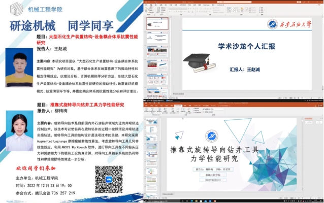20221223日王趙誠(chéng)同學(xué)“大型石化生產(chǎn)裝置結(jié)構(gòu)-設(shè)備耦合體系抗震性能研究”為題,提出耦合體系的抗震性能分析和評(píng)價(jià)理論。柳梅梅同學(xué)推靠式旋轉(zhuǎn)導(dǎo)向鉆井工具力學(xué)性能研究”為題,對(duì)導(dǎo)向工具軸承系統(tǒng)的負(fù)荷特性和摩擦磨損特性做進(jìn)一步分析。