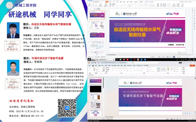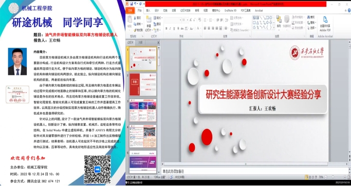20221224“車谷杯”第九屆中國(guó)研究生能源裝備創(chuàng)新設(shè)計(jì)大賽獲獎(jiǎng)?wù)咄跬?、李家輝和王歡暢分別分享了自己的設(shè)計(jì)成果、經(jīng)驗(yàn)與心得,會(huì)后就同學(xué)們提出的問(wèn)題做出解答,為同學(xué)們下一步參賽作參考。