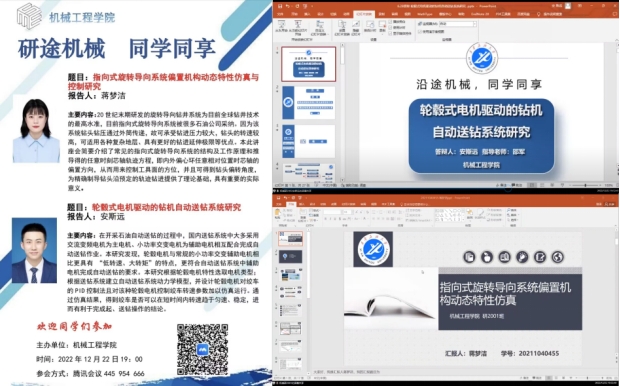 為豐富研究生文化生活,提高研究生培養(yǎng)質(zhì)量,營(yíng)造濃厚學(xué)術(shù)氛圍,促進(jìn)學(xué)生之間學(xué)習(xí)與交流,增進(jìn)研究生對(duì)各專業(yè)領(lǐng)域認(rèn)識(shí)的深度和廣度,并鍛煉其思維、邏輯以及語(yǔ)言組織和表達(dá)能力,提升研究生的學(xué)術(shù)素養(yǎng)。2022122120221224日機(jī)械工程學(xué)院的“研途機(jī)械 同學(xué)同享”研究生學(xué)術(shù)沙龍活動(dòng)成功拉開(kāi)帷幕,活動(dòng)由2020級(jí)、2021級(jí)共9名優(yōu)秀學(xué)生代表做報(bào)告,吸引了800余人次研究生參加。此次活動(dòng)由2022級(jí)劉海穎同學(xué)主持。