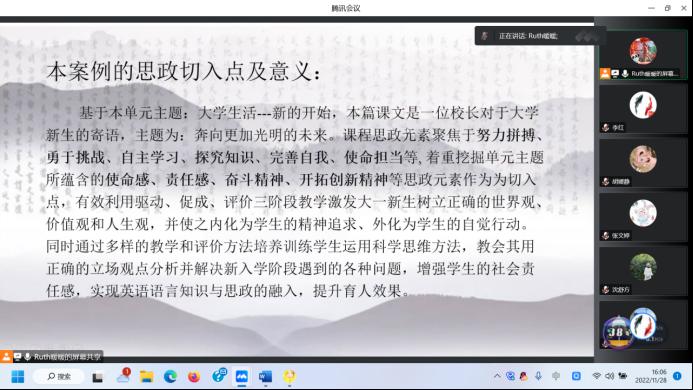 政治理論學(xué)習(xí)會(huì)后,大學(xué)外語(yǔ)第二教學(xué)部黨支部召開全體黨員大會(huì)。集體學(xué)習(xí)了《中國(guó)共產(chǎn)黨第二十次全國(guó)代表大會(huì)報(bào)告》。會(huì)議強(qiáng)調(diào),學(xué)習(xí)宣傳貫徹黨的二十大精神是今后一個(gè)時(shí)期的首要政治任務(wù),支部全體黨員要提高思想認(rèn)識(shí),切實(shí)增強(qiáng)學(xué)習(xí)的自覺性和堅(jiān)定性,積極參加學(xué)院黨委“學(xué)習(xí)二十大,奮進(jìn)新征程”黨的二十大精神知識(shí)競(jìng)賽活動(dòng),確保學(xué)有成效。隨后,沈舒方和畢瑩兩位黨員教師從教學(xué)目標(biāo)的思政建設(shè)設(shè)置、課堂活動(dòng)的引導(dǎo)、課外活動(dòng)的促進(jìn)、將思政建設(shè)活動(dòng)與專業(yè)教育進(jìn)行雙融合等方面進(jìn)行了課程思政案例分享。
