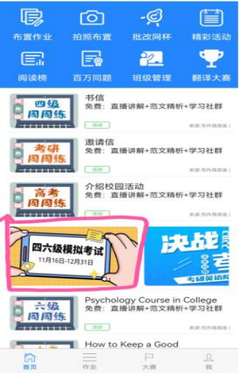 為達(dá)到良好的模擬測(cè)試效果,此次??际褂门木W(wǎng)平臺(tái)進(jìn)行發(fā)布,于11月19日至11月25日對(duì)我校學(xué)生進(jìn)行線上模擬測(cè)試。外國(guó)語(yǔ)學(xué)院規(guī)劃考試安排,細(xì)化考試流程,并且??碱}型全面,來(lái)源權(quán)威,具有重要的模擬價(jià)值。在大學(xué)英語(yǔ)四級(jí)考試前對(duì)學(xué)生進(jìn)行此次模擬演練,目的讓學(xué)生熟悉題型、鍛煉心態(tài),了解四級(jí)的命題特點(diǎn),難度和題型,提高同學(xué)們對(duì)大學(xué)英語(yǔ)四級(jí)考試的重視度和應(yīng)試能力,引導(dǎo)同學(xué)們積極備戰(zhàn),實(shí)現(xiàn)個(gè)人英語(yǔ)水平的有效提升、疑難問(wèn)題的專(zhuān)項(xiàng)突破,幫助同學(xué)們?cè)缛枕樌ㄟ^(guò)大學(xué)英語(yǔ)四級(jí)考試。