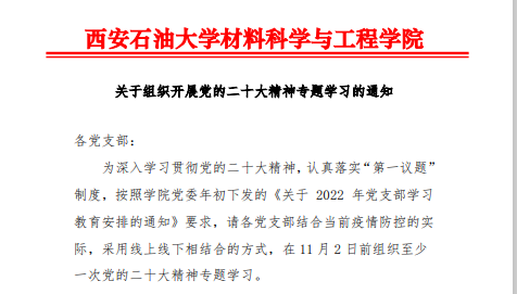 學(xué)院下發(fā)了《關(guān)于組織開(kāi)展黨的二十大精神專題學(xué)習(xí)的通知》,各黨支部按照要求通過(guò)線下與線上相結(jié)合的方式開(kāi)展了第一次專題學(xué)習(xí)。