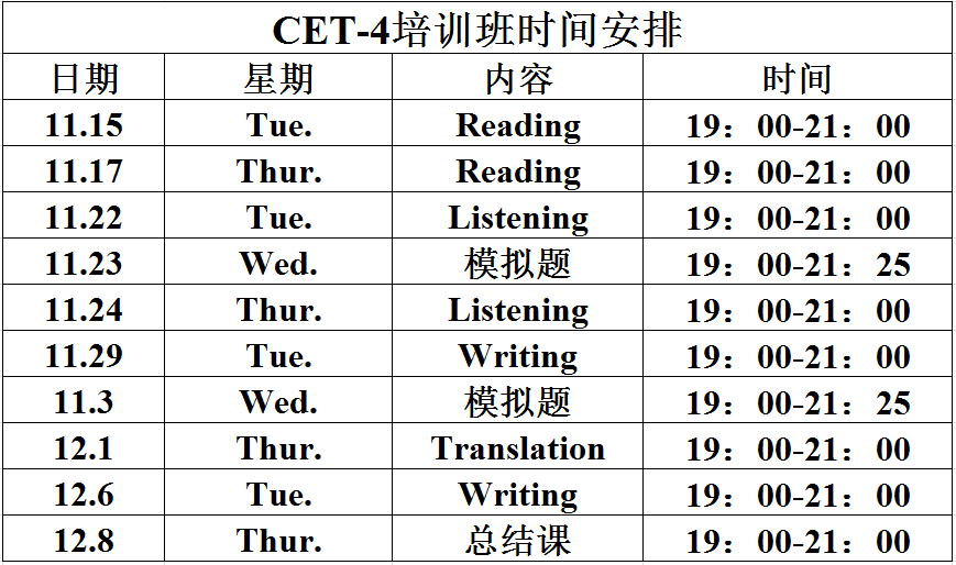 本次大學(xué)英語四級沖刺培訓(xùn)班是學(xué)院加強學(xué)風(fēng)建設(shè)的一項重要舉措,切實從學(xué)生的實際需求出發(fā),通過精心制定培訓(xùn)計劃和教學(xué)內(nèi)容,幫助學(xué)生解決困惑,充分發(fā)揮朋輩幫扶的力量,進一步促進學(xué)生的能力提升,營造積極向上的學(xué)習(xí)氛圍,不斷提高人才培養(yǎng)質(zhì)量。