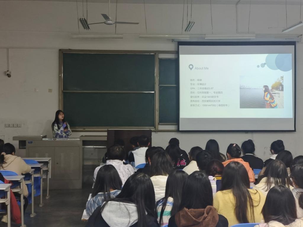 辛怡萱同學向同學們詳細講解了保研推免的資格獲取要求,以及多種保研方法,很詳細地將準備資料、院校面試、確定錄取各個時間段中的問題進行解釋,期間不斷回應同學們的疑惑。希望同學們懂得利用學校資源,從而彌補自己的不足。最后她特別強調了設計類專業(yè)英語四級的重要性,并將自己學習四級的應試技巧進行了分享。