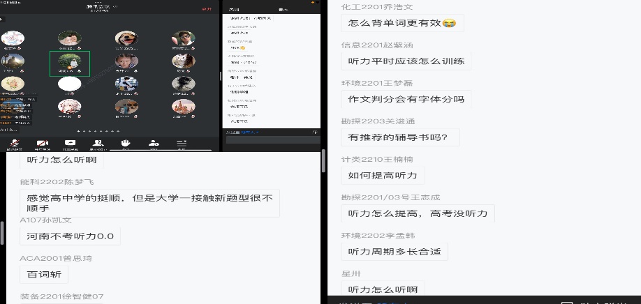 曾思琦、張雯婕、黃云龍、李卓爾和孫嘉5位在大學英語四、六級考試以及各種競賽中取得優(yōu)異成績的同學分享了各類考試、競賽經驗和學習體會,并對同學們提出的問題進行了詳細解答。曾思琦通過四個方面的講述,分享了自己的學習經驗和方法。張雯婕從自己的英語學習經歷出發(fā),詳細地展示了自己是如何有效地學習積累詞匯,并對英語競賽備賽以及大學英語四、六級備考提出了具體的建議。黃云龍講述了自己的大學英語六級奮戰(zhàn)之路,強調了利用好真題、復盤反思和心態(tài)的重要性。李卓爾從大學英語四、六級備考、英語競賽、日常積累和生活中的英語學習四個方面分享自己的經驗。孫嘉分享了英語詞匯學習和口語練習方法,強調了參加英語競賽的重要性。