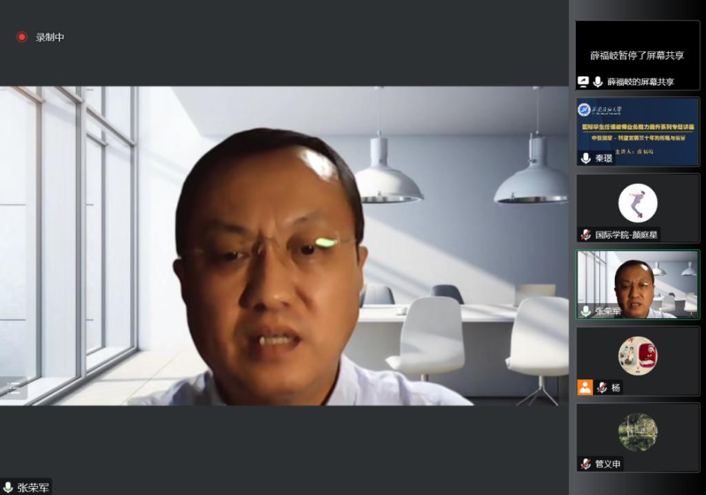 2022年10月27日晚,培訓活動的首場講座《中亞國家-轉(zhuǎn)型發(fā)展三十年的歷程與前景》于線上舉行。該講座由中國社會科學院俄羅斯東歐中亞研究所研究員、戰(zhàn)略研究室主任,中俄戰(zhàn)略協(xié)作高端合作智庫辦公室主任,國務院發(fā)展研究中心歐亞社會發(fā)展研究所研究員、中國國際電視臺俄語頻道特約評論員薛福岐博士主講。副校長張榮軍教授主持,陜西省人民對外友好協(xié)會歐亞部部長梁鋒出席,我校國際教育學院(絲路能源學院)、外國語學院、人文學院等院(系)及單位近150名師生參加了本次講座。