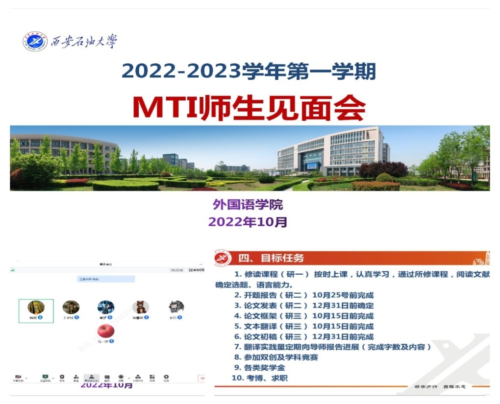各位研究生導(dǎo)師圍繞2022級(jí)研究生課程學(xué)習(xí)、2021級(jí)研究生學(xué)位論文開(kāi)題和翻譯實(shí)習(xí)實(shí)踐、2020級(jí)研究生學(xué)術(shù)論文發(fā)表與學(xué)位論文撰寫(xiě)、研究生創(chuàng)新實(shí)踐項(xiàng)目的申報(bào)、以及翻譯實(shí)踐任務(wù)的完成情況等,聽(tīng)取了學(xué)生的匯報(bào),進(jìn)行了細(xì)致的指導(dǎo),并提出下一步的工作要求。導(dǎo)師們鼓勵(lì)學(xué)生在封閉期間更要合理安排時(shí)間,規(guī)劃好學(xué)習(xí)和生活,要充分利用圖書(shū)館等良好的學(xué)習(xí)環(huán)境以及學(xué)校豐富的線上線下學(xué)習(xí)資源,既要確保健康安全,又要高效推進(jìn)學(xué)業(yè)發(fā)展。