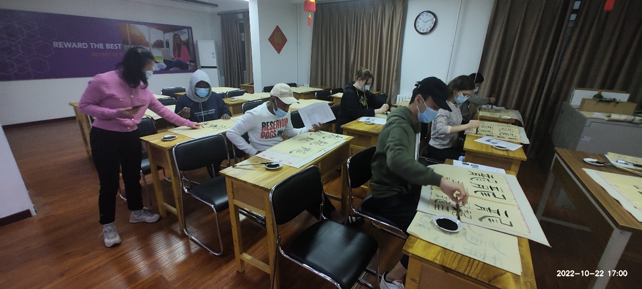 為豐富學(xué)校靜默管理期間在校國際學(xué)生的文化生活,10月22日下午,國際教育學(xué)院在明德公寓101教室舉辦了國際學(xué)生系列文化活動主題之二—中國書法興趣課堂,并組織來自烏干達(dá)、俄羅斯、哈薩克斯坦等國的國際學(xué)生參加了書法學(xué)習(xí)第一課,學(xué)寫漢字“龍”。