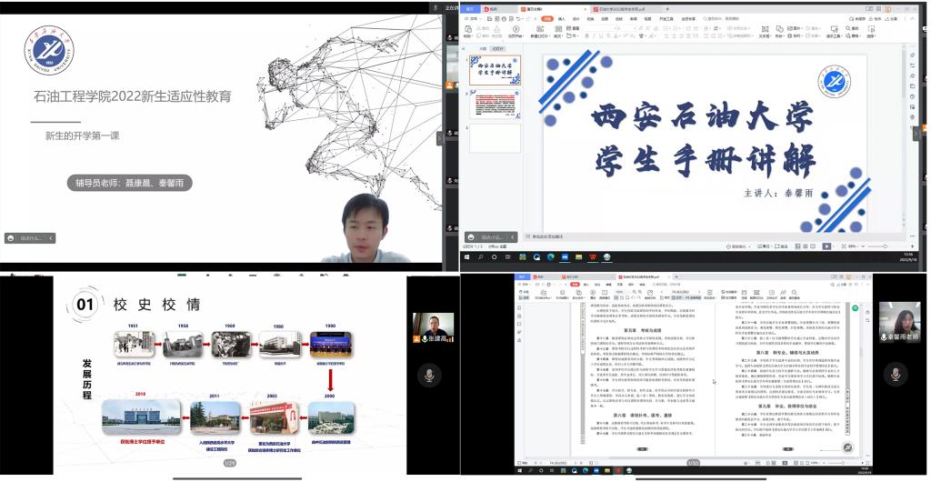 院系入學教育主要包含新生專業(yè)教育,新生適應教育,石油、鐵人精神教育等活動。新生適應性教育工作以線上報告會形式組織進行,會議由石油工程學院黨委副書記張建高主持,2021級輔導員秦馨雨、2022級輔導員聶康晨聯(lián)合參與。報告會圍繞校史校情、校紀校規(guī)、校園安全、學風建設(shè)、校園生活五個方面詳細展開。張建高老師表示,學習校史,參觀“兩館”,目的是幫助新生了解學校發(fā)展歷程和取得的輝煌成就,感受先賢在辦學過程中不畏險阻、砥礪奮進的辦學精神,培養(yǎng)自身團結(jié)、勤奮、求是、創(chuàng)新的品格,踐行好學力行、自強不息的校訓。秦馨雨老師對《西安石油大學學生手冊》進行宣講,使新生了解學校的各項規(guī)章制度,養(yǎng)成自覺遵守校規(guī)校紀的良好習慣;她從教學管理制度與學生管理制度角度出發(fā),教育學生要做到誠實守信,鼓勵其追求上進,爭創(chuàng)優(yōu)良學風。聶康晨老師結(jié)合政治、網(wǎng)絡(luò)、飲食、出行、心理安全等多方面的典型案例,引導新生樹立安全意識,養(yǎng)成良好的行為習慣,以減少校園不穩(wěn)定的因素,保障自身身心健康。會上新生積極與老師互動交流,教育效果良好。