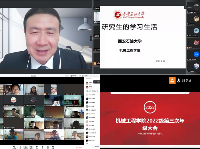 9月17日-19日,機(jī)械工程學(xué)院召開2022級(jí)全體本研新生入學(xué)教育線上會(huì)議。機(jī)械工程學(xué)院院長(zhǎng)竇益華、副院長(zhǎng)崔璐、黨委副書記劉冰先后應(yīng)邀出席會(huì)議,會(huì)議分別由輔導(dǎo)員歐紅娟、劉思文主持。竇益華院長(zhǎng)向同學(xué)們介紹相關(guān)學(xué)科專業(yè)的特色和優(yōu)勢(shì),開展專業(yè)教育,圍繞我校“石油精神辦學(xué),鐵人精神育人,延安精神鑄魂”的特色,將石油精神鐵人精神教育和專業(yè)教育相結(jié)合,引導(dǎo)新生領(lǐng)悟石油精神鐵人精神內(nèi)涵,奮發(fā)圖強(qiáng),刻苦學(xué)習(xí)專業(yè)知識(shí),掌握扎實(shí)本領(lǐng)。崔璐副院長(zhǎng)根據(jù)學(xué)校研究生相關(guān)管理制度,結(jié)合院系實(shí)際,開展新生校規(guī)校紀(jì)教育,并組織新生觀看疫情防控知識(shí)。劉冰副書記參加本科生會(huì)議指出,疫情期間實(shí)行靜態(tài)化管理,各位新生要嚴(yán)格落實(shí)疫情管理規(guī)定,定期進(jìn)行核酸檢測(cè),養(yǎng)成公共區(qū)域戴口罩的良好習(xí)慣。歐紅娟、劉思文老師從遵守校規(guī)校級(jí)及安全方面做出教育,并希望同學(xué)們注意宿舍安全及網(wǎng)絡(luò)安全等設(shè)立好學(xué)習(xí)目標(biāo),保持良好精神面貌,融入集體,要結(jié)合自身實(shí)際,確立好未來發(fā)展方向。