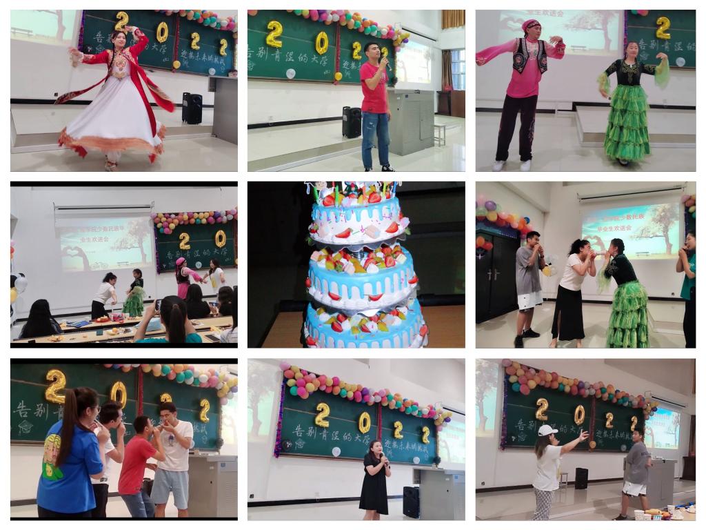 學(xué)院為向畢業(yè)學(xué)子們表達(dá)祝愿之情特意訂購(gòu)了畢業(yè)主題大蛋糕,希望各位畢業(yè)生也能像這蛋糕一樣甜甜蜜蜜的創(chuàng)造屬于自己的輝煌人生!在一片愉快的氛圍中,人文學(xué)院木尼熱給大家?guī)?lái)了優(yōu)美的獨(dú)舞《阿圖什》,2020級(jí)凱力比努爾清唱一首民族歌曲《在路上》,2020級(jí)吾勒努爾和化學(xué)化工學(xué)院2020級(jí)布海里且木演唱的《忽然之間》、《小幸運(yùn)》,為現(xiàn)場(chǎng)帶來(lái)了甜甜的青春氣息,2021級(jí)古麗達(dá)爾和吾勒佳帶來(lái)了哈薩克族雙人舞《黑走馬》。在節(jié)目中間還穿插進(jìn)行了氣球傳紙杯、吸管傳皮筋等互動(dòng)小游戲成功將氣氛引向了高潮。