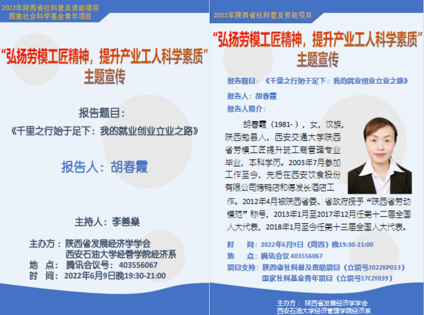 為全面貫徹落實(shí)習(xí)近平總書記關(guān)于科普和科學(xué)素質(zhì)建設(shè)的重要論述,大力弘揚(yáng)勞模精神、勞動(dòng)精神、工匠精神,積極引領(lǐng)廣大青年大學(xué)生在理論學(xué)習(xí)中、擇業(yè)立業(yè)中、工作實(shí)踐中,堅(jiān)定理想信念和職業(yè)精神,6月9日,經(jīng)濟(jì)管理學(xué)院邀請(qǐng)第十三屆全國(guó)人民代表大會(huì)代表、陜西省勞動(dòng)模范胡春霞同志,以《千里之行始于足下:我的就業(yè)創(chuàng)業(yè)立業(yè)之路》為題,為學(xué)院青年大學(xué)生作線上專題宣講報(bào)告,活動(dòng)由學(xué)院經(jīng)濟(jì)系教師李善燊主持。