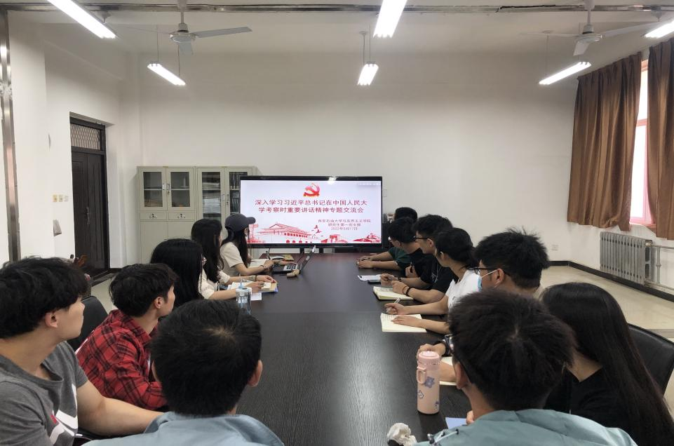 2022年5月17日上午,馬克思主義學(xué)院研究生第一黨支部在鄠邑校區(qū)崇文樓325會(huì)議室召開(kāi)會(huì)議,專題學(xué)習(xí)習(xí)近平總書記在中國(guó)人民大學(xué)考察時(shí)重要講話精神,會(huì)議由黨支部宣傳委員劉笑含主持,支部全體黨員、積極分子參加。