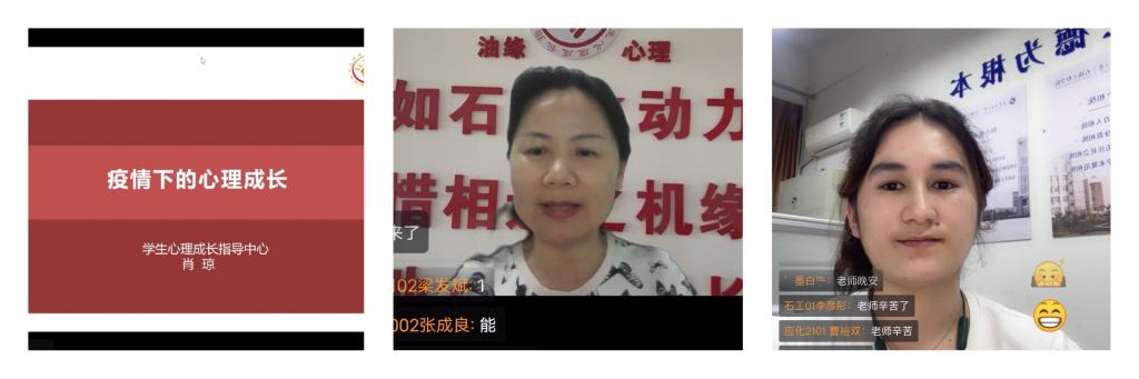 為進一步落實我校第七屆“陽光護航”心理育人季活動,扎實做好疫情期間學生心理健康教育工作,促進學生心理成長, 5月9日19:00我校學生心理成長指導中心主任肖瓊教授在騰訊會議舉辦《疫情下的心理成長》專題講座。石油工程學院和研究生工作部學生代表、心理委員代表等近500名師生在線觀看學習,講座由石油工程學院2020級輔導員祖力皮亞主持。