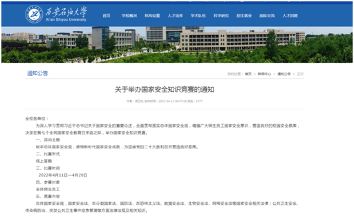 411日起,國(guó)家安全教育日到來前,在疫情防控總體要求下,與校穩(wěn)定辦公室、黨委學(xué)工部、黨委研工部開展“國(guó)家安全知識(shí)競(jìng)賽”答題活動(dòng),積極組織全校廣大師生員工參與線上答題活動(dòng),提升廣大師生員工的國(guó)家安全意識(shí)。