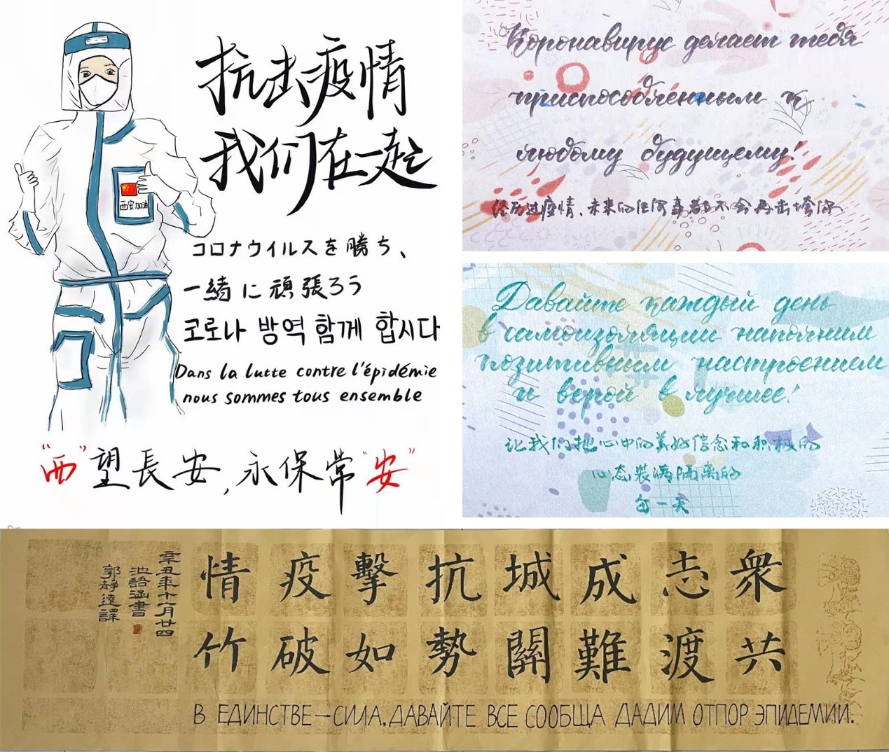 面對這場沒有硝煙的戰(zhàn)爭,學(xué)院積極引導(dǎo)學(xué)生充分發(fā)揮專業(yè)優(yōu)勢和個人特長,將習(xí)近平總書記“營造萬眾一心阻擊疫情的輿論氛圍,凝聚起眾志成城、共克時艱的強(qiáng)大正能量”的重要指示落到實處。用俄語、法語、西班牙語、韓語、日語……等多語種錄制抗疫宣傳視頻,為戰(zhàn)疫加油,為西安加油。并鼓勵大家發(fā)揮個人特長,用筆墨鼓舞抗疫斗志、禮贊抗疫英雄,傳遞“西石大溫度”。